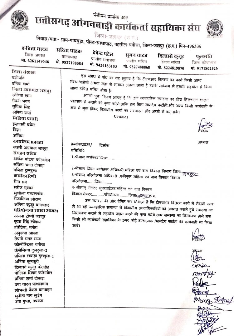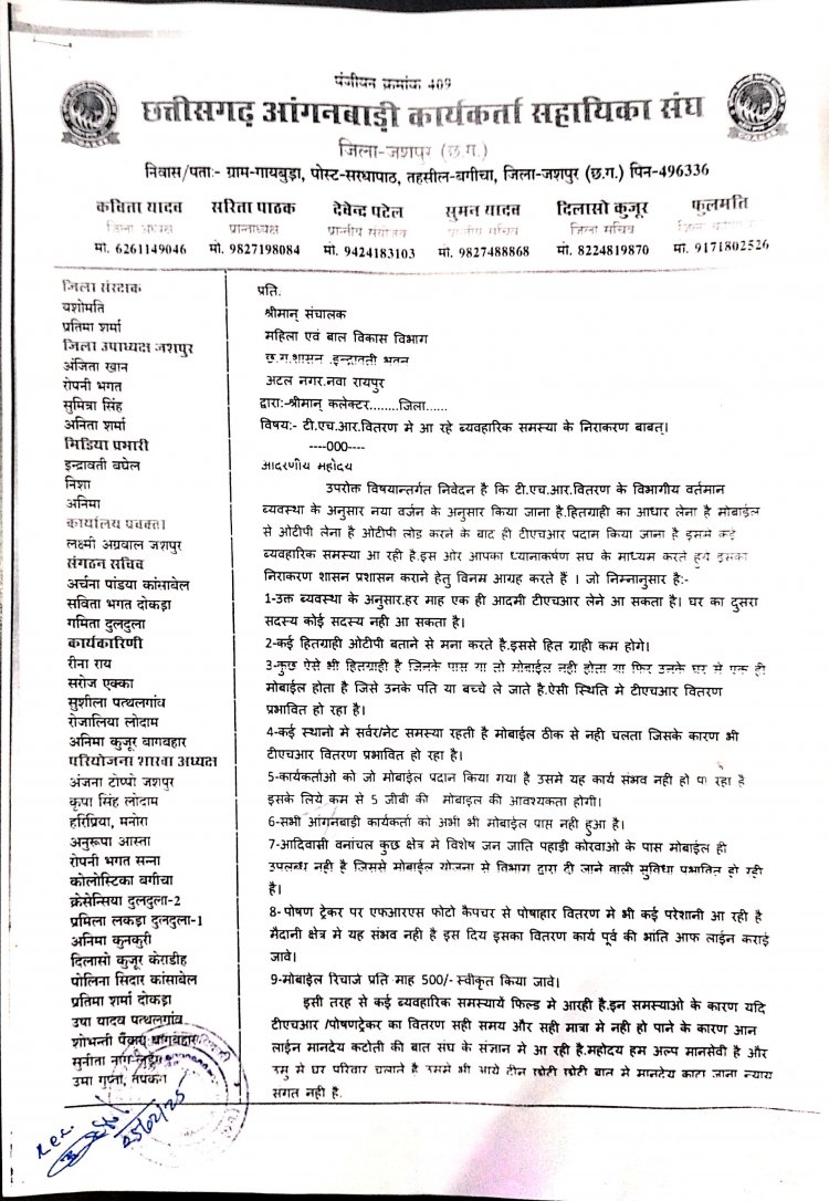 विदित हो कि छत्तीसगढ़ आंगनबाड़ी कार्यकर्ता सहायिका संघ पंजी 409.के द्वारा गत दिनों प्रधानमंत्री नरेंद्र मोदी,छत्तीसगढ़ के मुख्यमंत्री विष्णुदेव साय,केंद्रीय मंत्री महिला एवं बाल विकास विभाग भारत सरकार,मंत्री महिला एवं बाल विकास विभाग छत्तीसगढ़ शासन सहित संचालन और सचिव महिला एवं बाल विकास विभाग छत्तीसगढ़ शासन को प्रदेश भर में ज्ञापन सौंपा था,जिसके बाद संयुक्त मंच के बैनर तले छत्तीसगढ़ आंगनबाड़ी कार्यकर्ता सहायिका संघ पंजी.409 द्वारा दिनांक 10 मार्च को राज्य भर में एकदिवसीय हड़ताल भी किया था।उसी का परिणाम है कि पोषण ट्रेकर ऐप में आ रही दिक्कतों को राज्य शासन ने गंभीरता से लिया और ऐप में तकनीकी त्रुटि को दूर कर समस्या का निदान किया है। उक्त गंभीर समस्या के दूर होने पर मुख्यमंत्री विष्णुदेव साय,मंत्री श्रीमती लक्ष्मी राजवाड़े,सचिव व संचालक महिला एवं बाल विकास विभाग छत्तीसगढ़ शासन का संघ ने धन्यवाद ज्ञापित किया है।